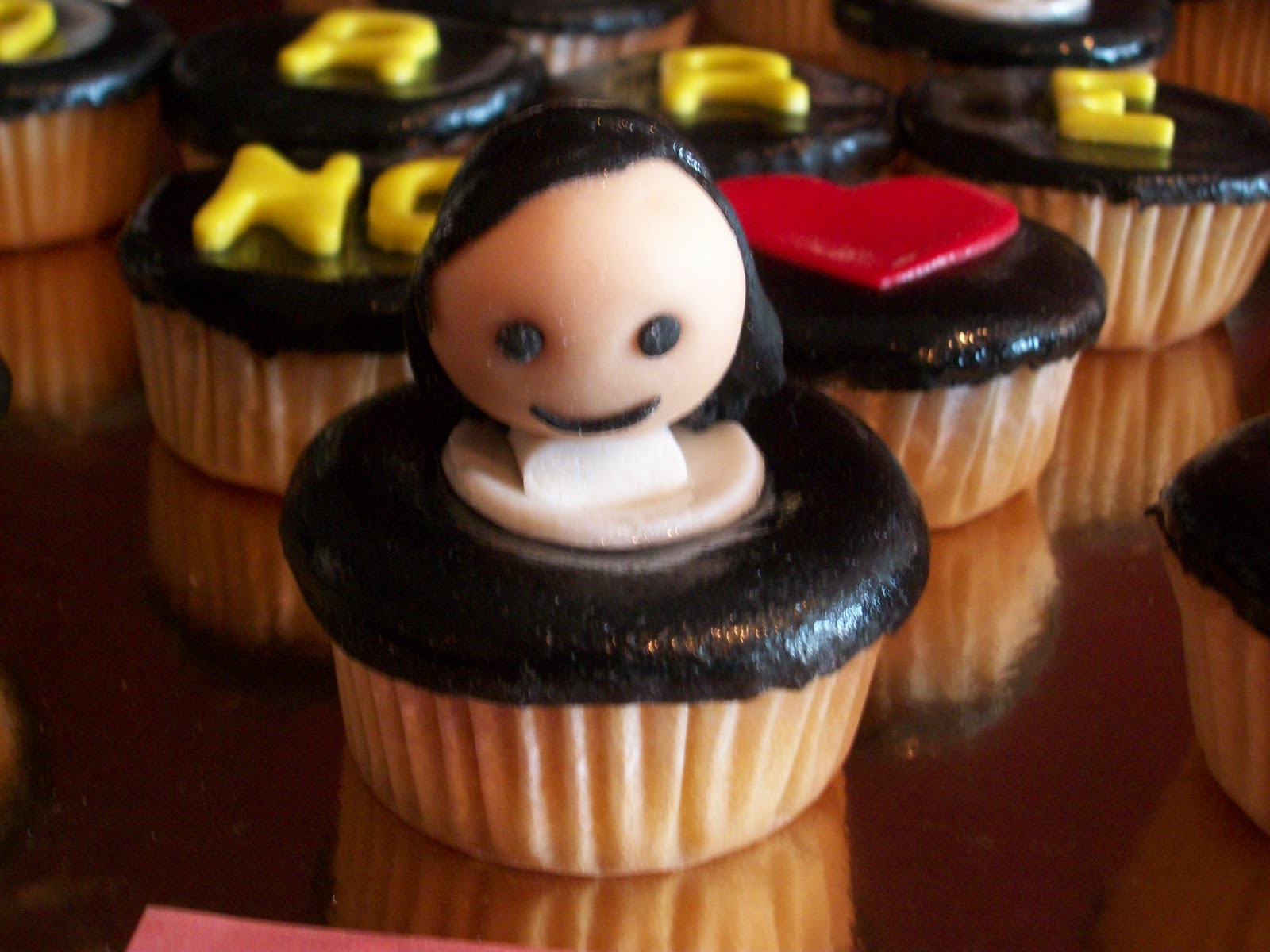 O elenco da peça de teatro "Garrett no Coração" e na mesa o elenco da mesma peça em formato cupcake;D